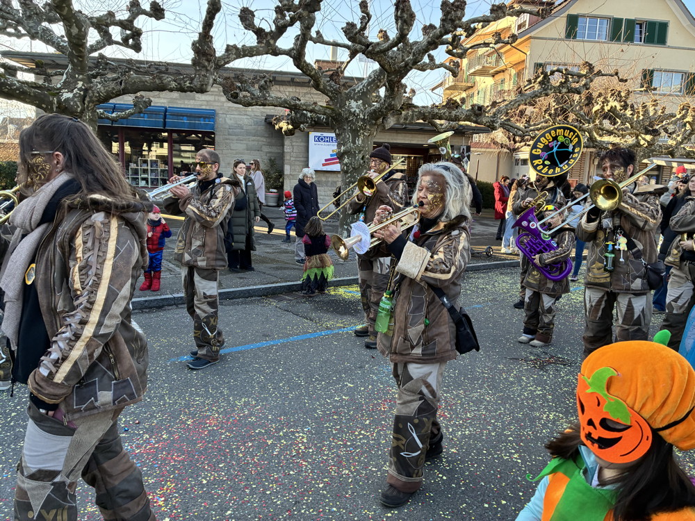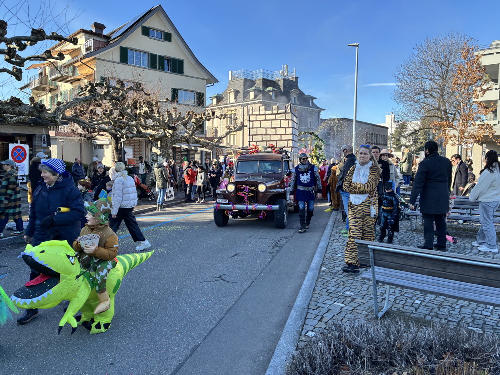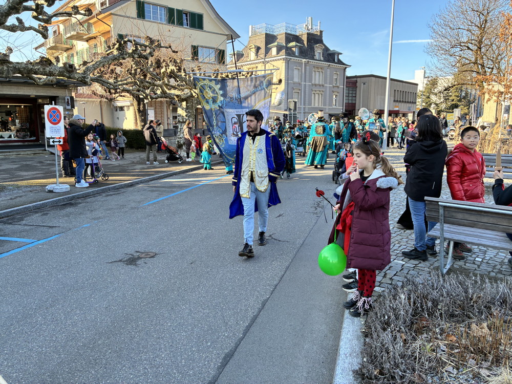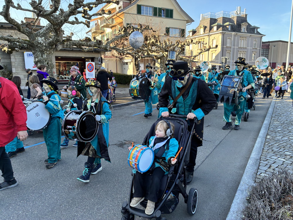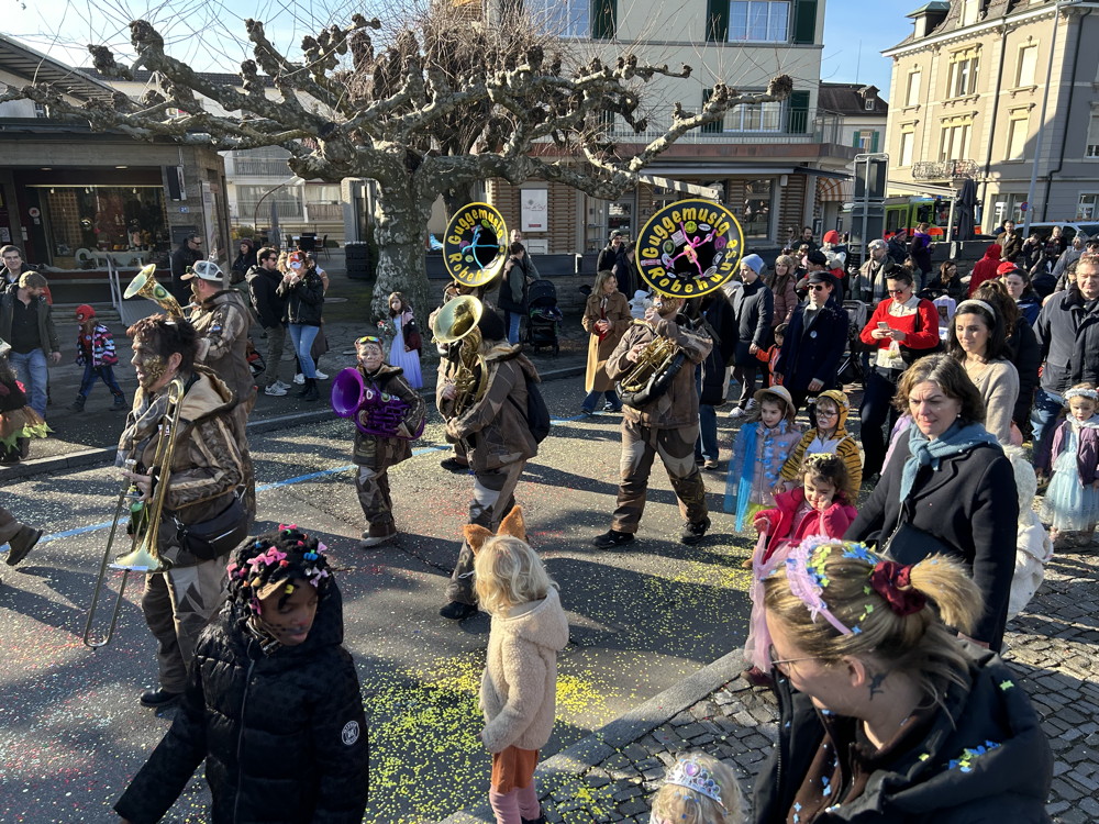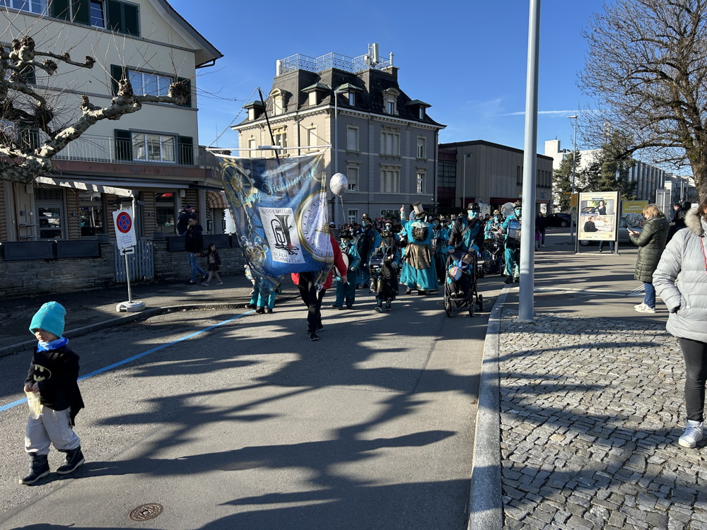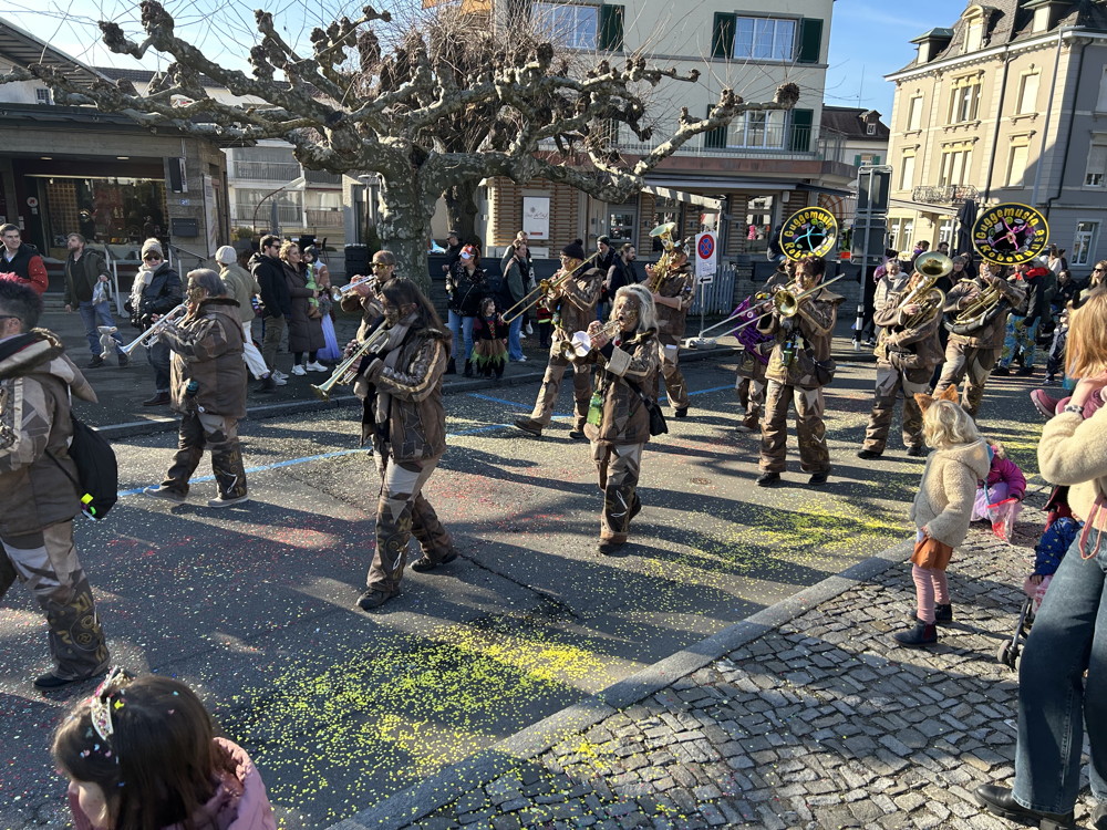 Zuerst kommt die Polizei, es folgt der Umzug mit zwei Guggen, die Feuerwehr mit zwei Autos und kurz danach ist auch schon die Putzequipe unterwegs.