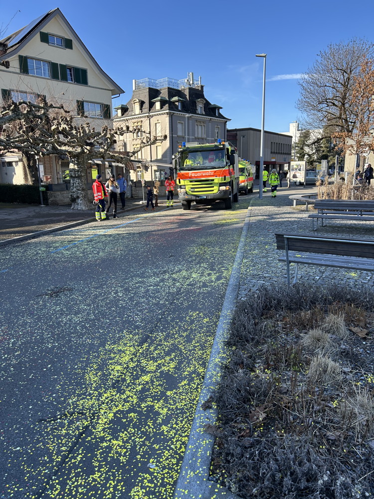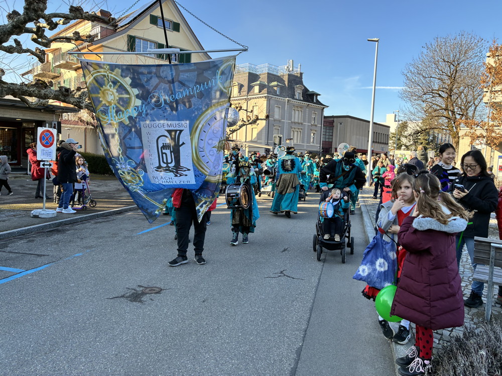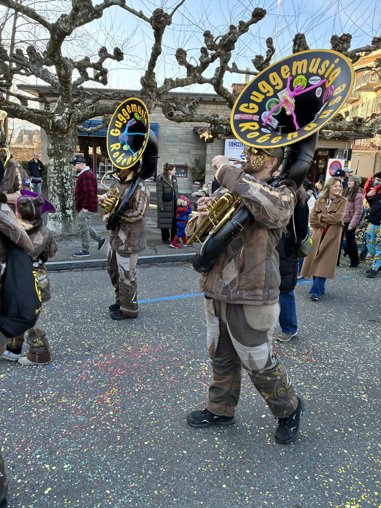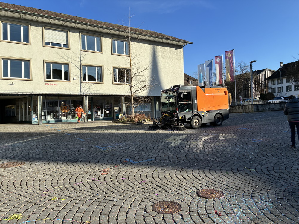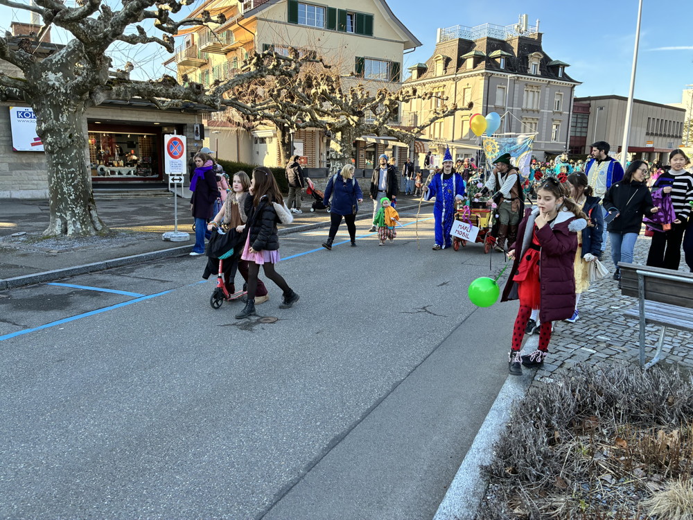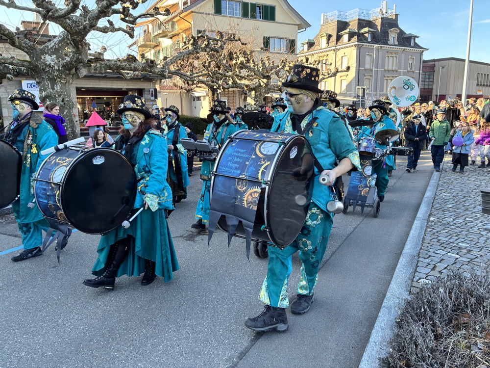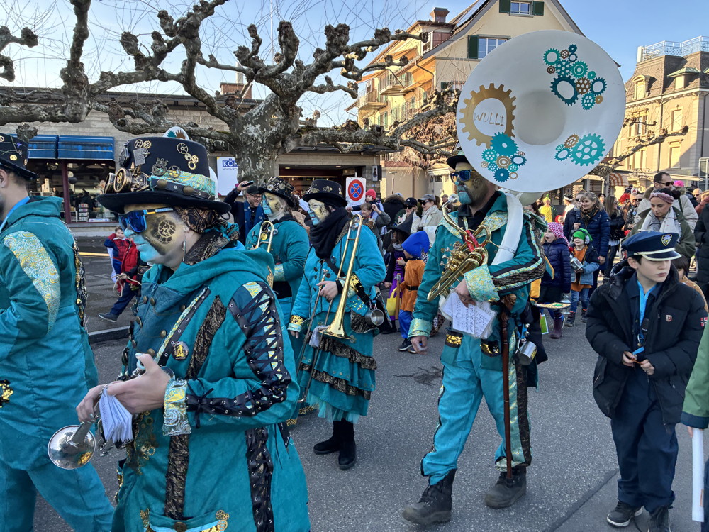 Zuerst kommt die Polizei, es folgt der Umzug mit zwei Guggen, die Feuerwehr mit zwei Autos und kurz danach ist auch schon die Putzequipe unterwegs.