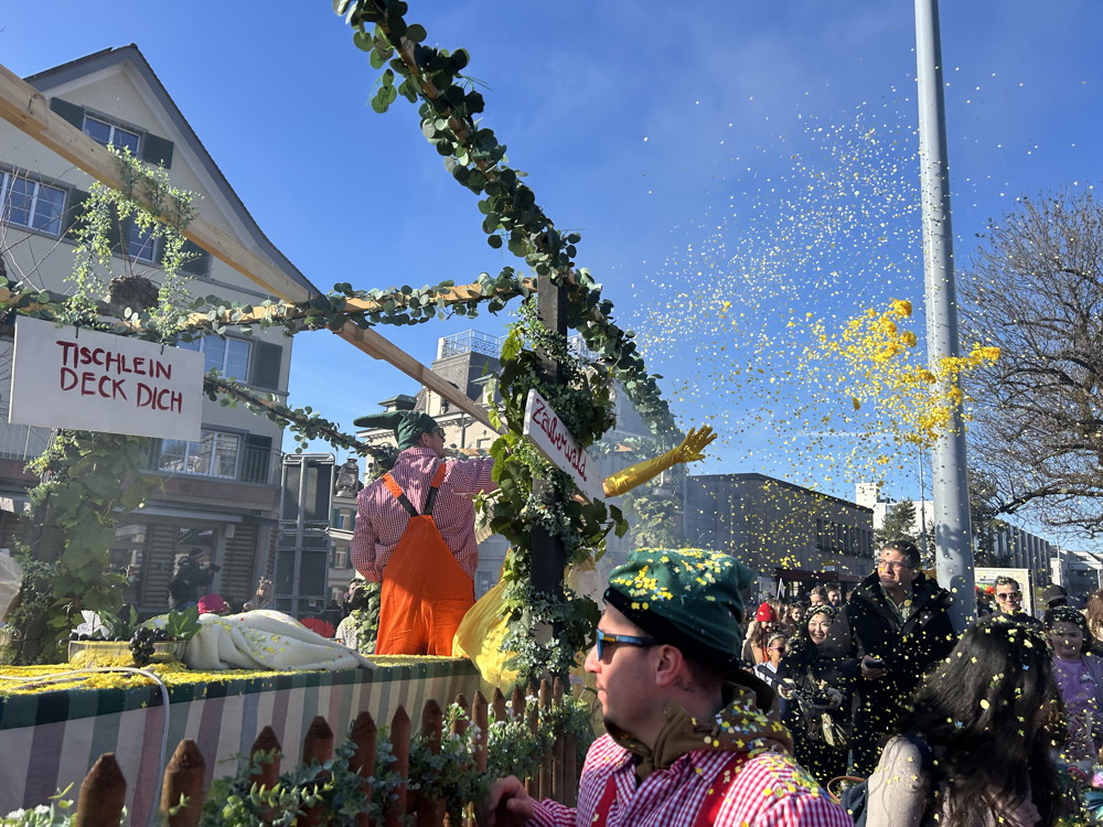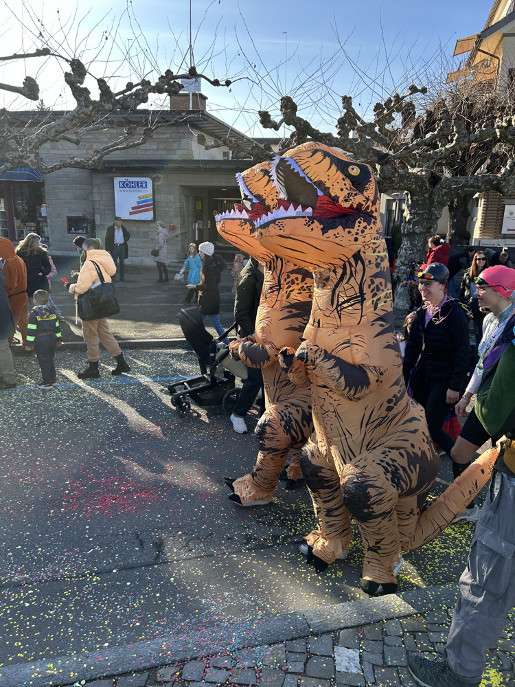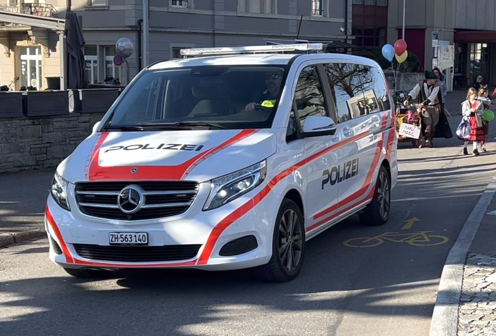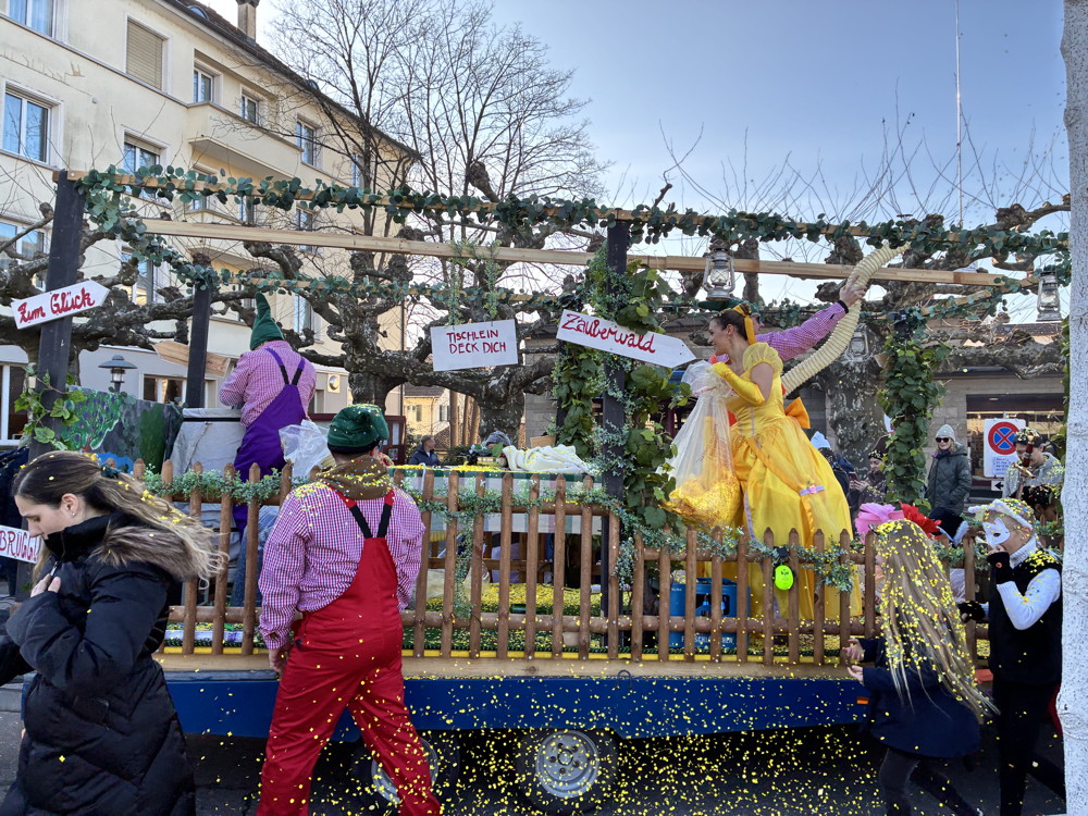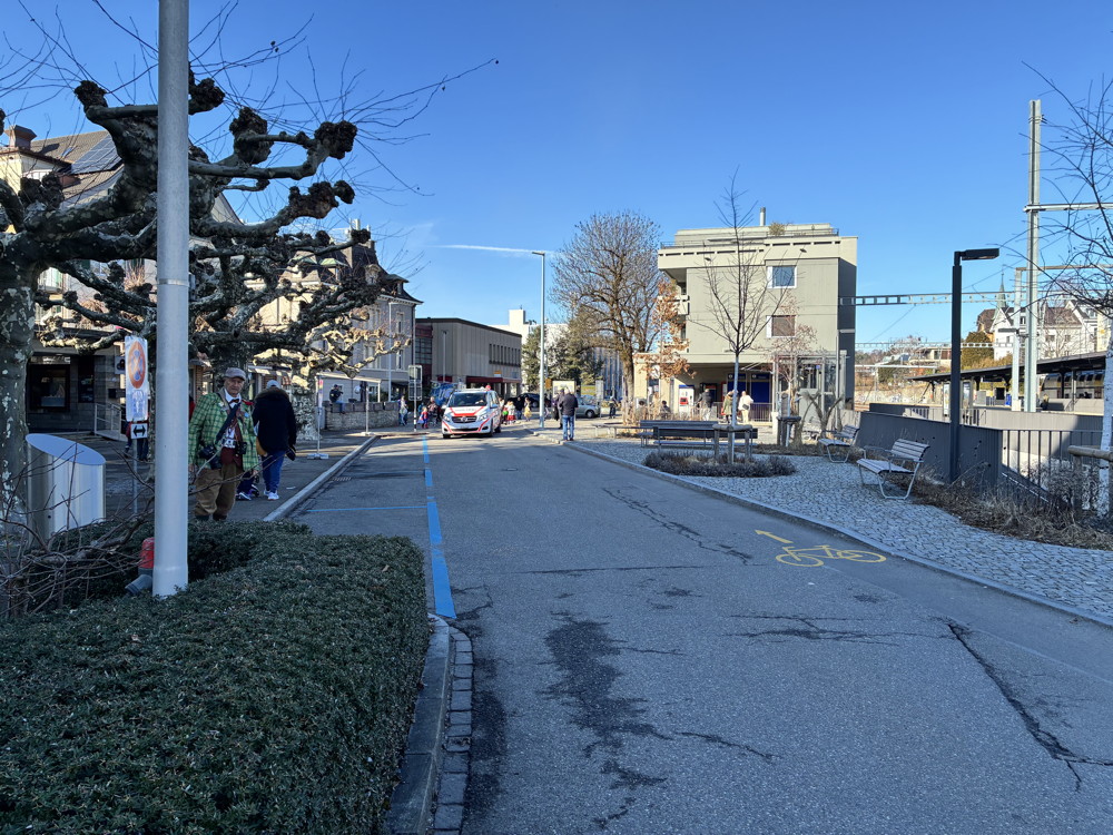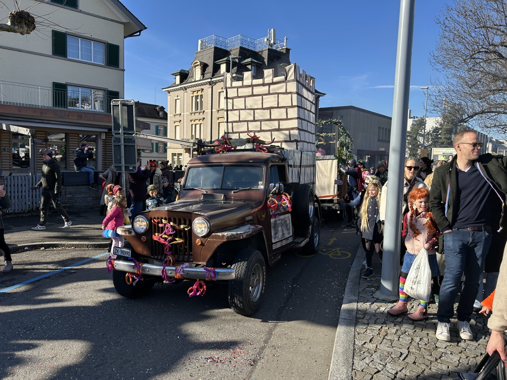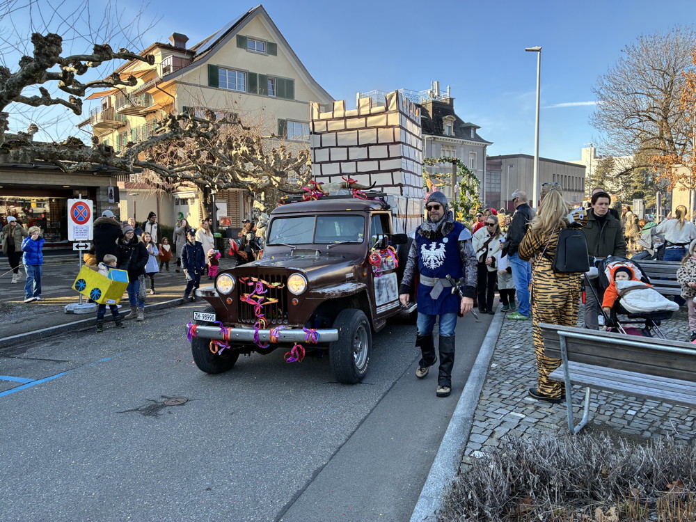 Zuerst kommt die Polizei, es folgt der Umzug mit zwei Guggen, die Feuerwehr mit zwei Autos und kurz danach ist auch schon die Putzequipe unterwegs.