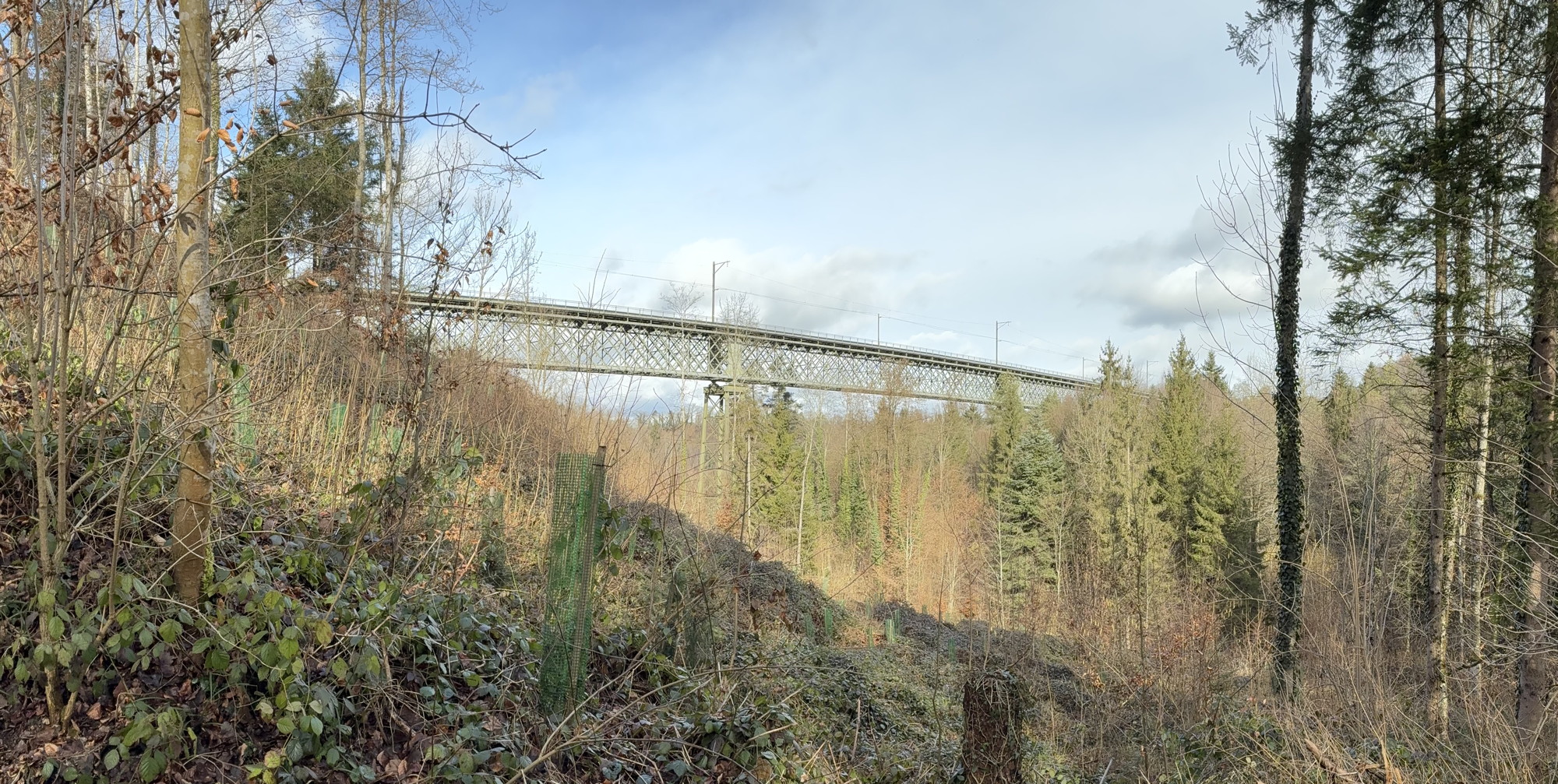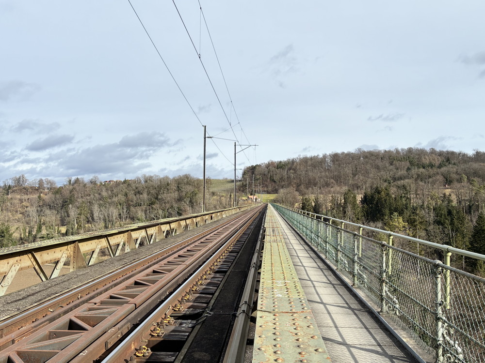 Von Ossingen am Schloss Wyden vorbei, über die Eisenbahnbrücke (Länge 332 m, an der höchsten Stelle 39,5 m hoch) zur Thurschleife und weiter nach Thalheim.